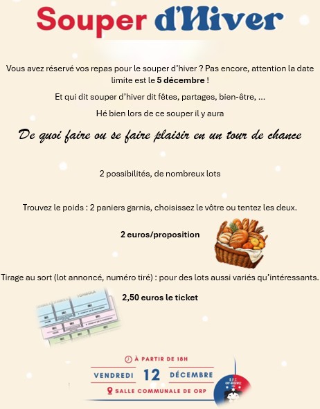 Premier souper de cette saison, au Hall Communal d’Orp-Le-Grand, sur la place communale. Un moment de convivialité autour d’un repas préparé sur place par nos chefs.